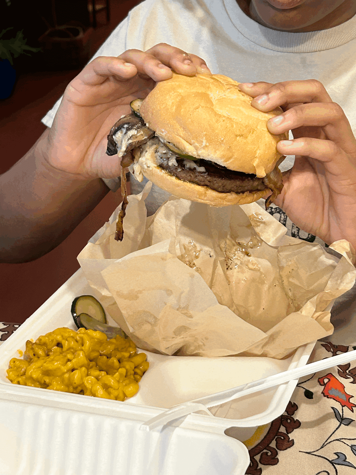 I ordered what the cashier called their second most popular sandwich (they were out of the NC-style barbeque)– The Kind Chkn Sandwich. It was a fried chicken sandwich topped with lettuce, tomato, pickles, onions, and mayo with a side of fries. My friend ordered the mushroom onion swiss burger with a side of mac and cheese, which they call “Soul Mac.”